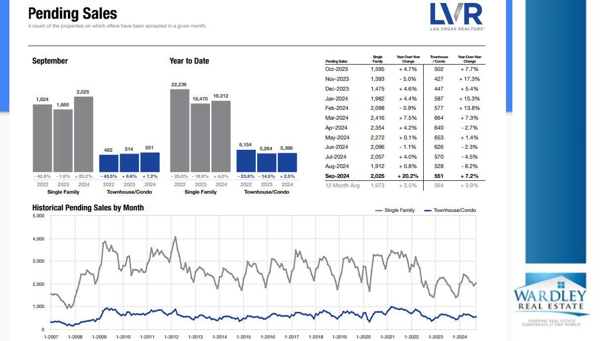 The Las Vegas Valley Real Estate Market received showed several positive signs in September, with New Listings up 12% from the year before and Pending Sales (accepted contracts that have not yet closed) up over 20% from the same time last year.