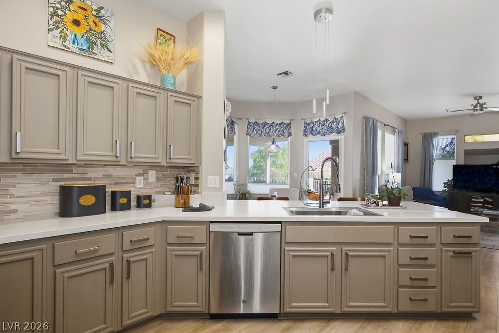Enjoy Strip views from inside and out in this lovingly updated 2,162 sq ft Regal model, a 3 bedroom, 2 bath home on a quiet corner lot in premier 55+ Sun City Summerlin. Strip views from the kitchen, dining nook, family room, and backyard patio are enjoyable during the day and even more prominent at night when the lights come alive. Enter through a gated, paved courtyard with valley views and custom double doors into a thoughtfully detailed home featuring newer LVP flooring and a warm, inviting palette. Interior highlights include glass-paneled doors, custom ceiling details, modern lighting, and a flowing layout ideal for daily living and entertaining. Expansive covered patio with fruit trees and a tranquil water feature. Split floorplan with a private primary suite offering dual vanities, jetted tub, separate shower, and generous closet space. Open kitchen with abundant windows overlooking the main living areas. Community offers golf, clubhouses, fitness, dining, and more.