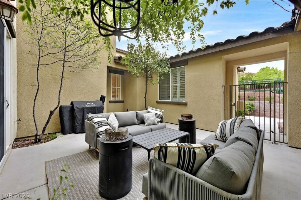 Perfect turnkey home in the heart of Summerlin?available furnished for a truly move-in ready experience! Ideally located near Downtown Summerlin, Red Rock, and convenient freeway access. This well-designed floorplan features a bedroom and full bath downstairs, plus two spacious primary suites upstairs. Tastefully finished with neutral flooring, stylish feature walls, shutters, classy lighting and a welcoming, secluded courtyard. The open kitchen offers quartz countertops, stainless appliances, new backsplash, and pantry, flowing into the living room with a gas fireplace and surround sound prewire. Dining room features two sets of French doors to the courtyard. The main primary suite includes a large walk-in closet and a spa-like bath with jetted tub, separate shower, and double sinks. Enjoy the community pool and spa! Newer HVAC (2 years) and Water heater (3 years) too! This is the home you have been waiting for!
