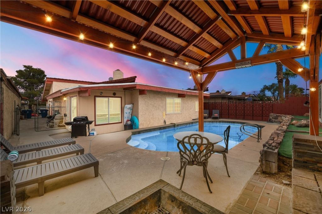 GREAT LOCATION*FULLY RENOVOVATED*PAID OFF TESLA SOLAR PANELS*PRIVATE POOL*NOHOA Move-in ready 4-bedrooom, 3-bath home just minutes from the Strip yet tucked away in a quiet, sanctuary-like neighborhood. Surrounded by shops, supermarkets, restaurants, and cafes, convenience is at your doorstep. This renovated property boasts smart features including fully paid off Tesla solar panels, Nest thermostat, security cameras, and upgraded pool equipment. A built-in video projection system with cinematic screen enhances family time and entertainment. The open concept kitchen offers granite counters, 42 upgraded cabinets, stainless steel appliances, flowing seamlessly into the dining room and great room. Bedrooms are thoughtfully placed on one side, each near an updated bathroom with modern fixtures and tile. Unique light fixtures, a cozy fireplace and solid flooring add warmth and style. The backyard is designed for relaxation and fun, featuring a sparkling pool and out door movie setup.