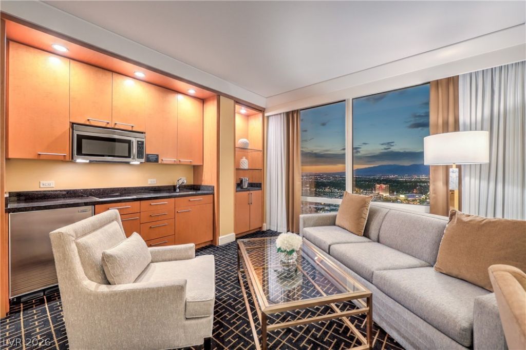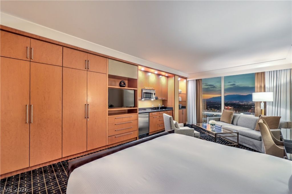 Perched on the 50th floor, this elegant 534-square-foot studio condominium offers breathtaking panoramic views of the glittering Las Vegas Strip skyline and the majestic surrounding mountains. Designed for sophisticated living, the residence masterfully blends modern luxury with effortless comfort. Floor-to-ceiling windows flood the space with natural light, while elegant crown molding, a plush king-sized bed, and custom built-in cabinetry create a refined atmosphere. The gourmet kitchenette is perfectly appointed for everyday convenience, and the spa-inspired bathroom features a double-sink vanity and an oversized six-foot soaking tub ? the ideal retreat after a day in the city. This high-floor haven delivers true resort-style living in one of Las Vegas' most prestigious addresses.