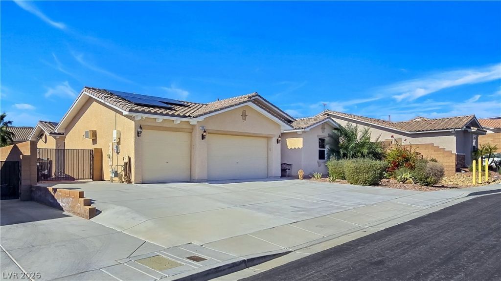 Truly unique semi-custom single story home with RV parking in Bilbray Ranch in Laughlin! As you enter the home, you are greeted with a dramatic entry with an open floor plan. Chef's kitchen is a masterpiece boasting custom cabinets, granite counters, breakfast bar, dining area, white appliances overlooking the living room great for entertaining. Laundry room with cabinets. 3 bedrooms and 2 bathrooms. The primary bedroom is showcasing the primary bath with a huge walk-in closet, soaking tub, shower and double sinks. Oversized 3 car garage. Resort style backyard oasis with a pool, covered patio w/shades, trees! The whole backyard is completely fenced with privacy fencing. SOLAR PANELS PAID IN FULL!!!