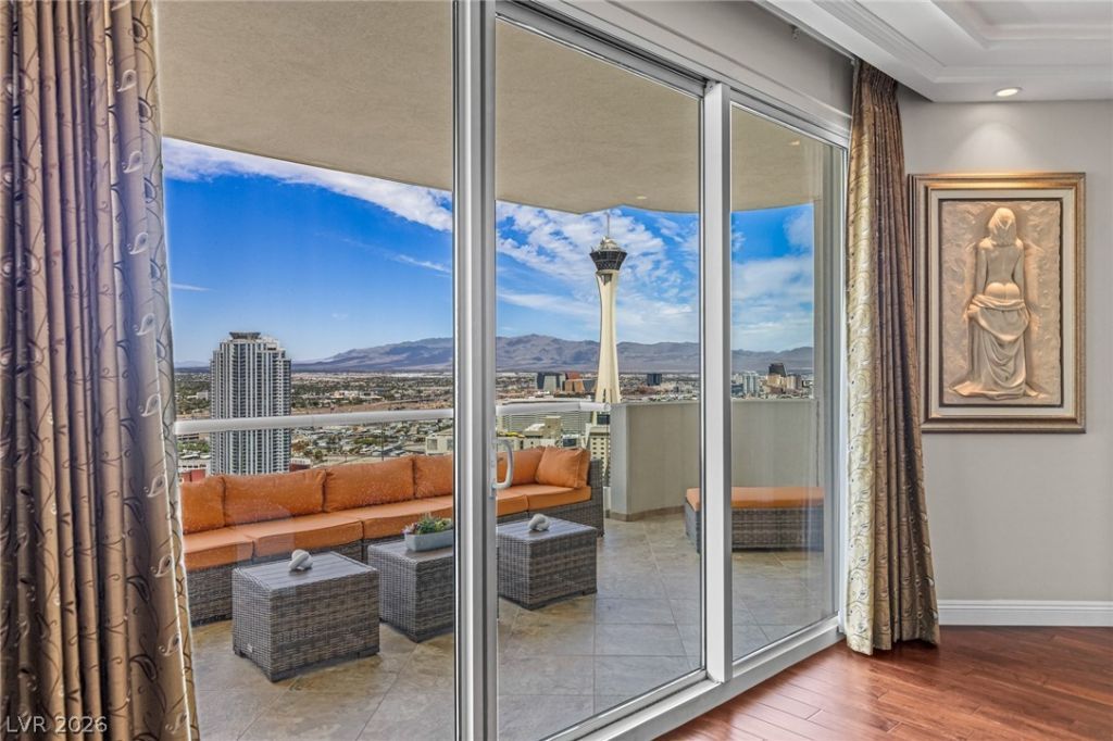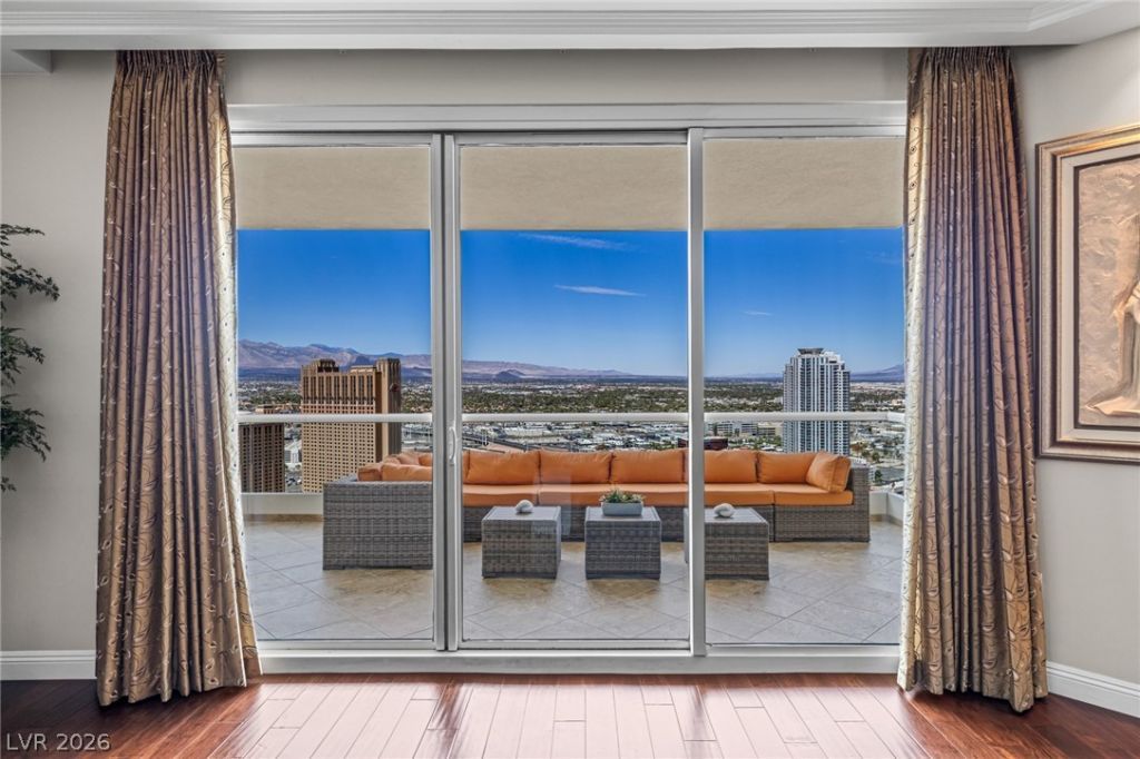 Stunning condo on the 35th floor w Unrivaled Day & Night views for Rent. FURNISHED, Large floor-plan & 2 spacious Primary suites. Panoramic views of the Strip, Downtown Las Vegas, Mountains & The lush Golf course. Dramatic 11' ceilings. A one of a kind high-rise w impeccable wood floors. Large rooms, 1 level throughout. 2,195 ft.² Interiors +479 ft.² of balconies, in addition, a powder room, laundry room w cabinets & sink. Two Enormous terraces. 1 storage unit, 1 car space +you may valet a 2nd car. The HOA fee covers;water, gas, cable, internet, valet, concierge, limo services, security, management on site & +. The Stirling club is located on the property grounds offering full spa services, salon, barber shop, massage, facials, nails. The club features a large & well equipped gym, pilates/yoga classes, tennis/pickle-ball courts, sauna, indoor/outdoor pools, gourmet restaurants, bar, cigar lounge, Starbucks, wine cellar & tasting room, space avail. for private functions. Welcome home!