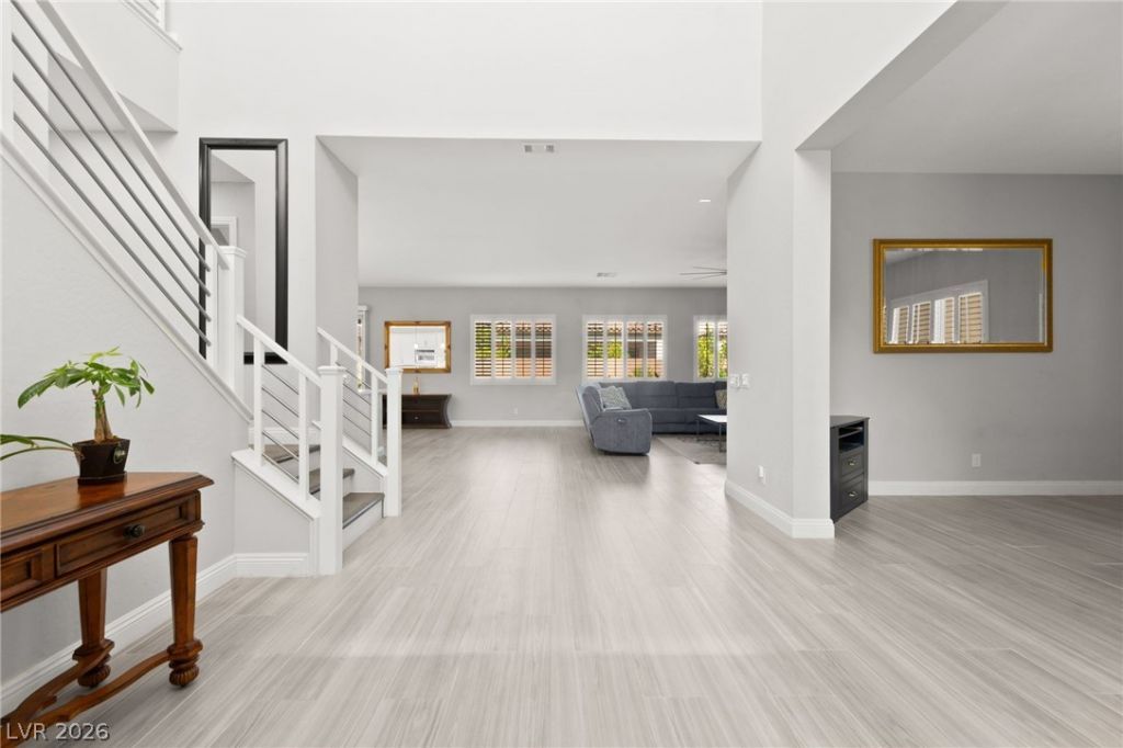 Welcome to this stunning two-story gem built in 2017, situated in the exclusive guard-gated community of Rhodes Ranch. This luxurious home offers four spacious bedrooms and five bathrooms, including a downstairs bedroom with its own shower?ideal for guests or multi-generational living. The heart of the home is the expansive, open-concept kitchen and living space, complete with a large island perfect for entertaining. The kitchen is accented with a sleek backsplash, while wood laminate flooring flows throughout the entire home, adding both warmth and ease of maintenance. Upstairs, you'll find generously sized bedrooms, including a luxurious primary suite. Outside, the backyard offers a covered patio and low-maintenance turf?perfect for relaxing afternoons. A three-car garage provides ample parking and storage space. This is your opportunity to experience a perfect blend of comfort, style, and security in one of Las Vegas' most sought-after communities.
