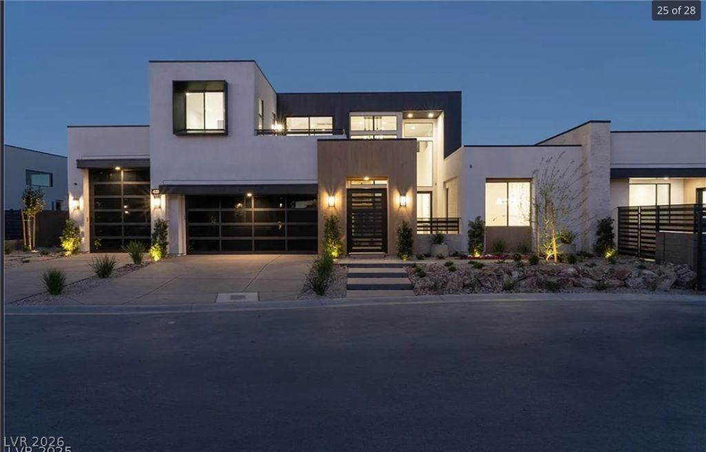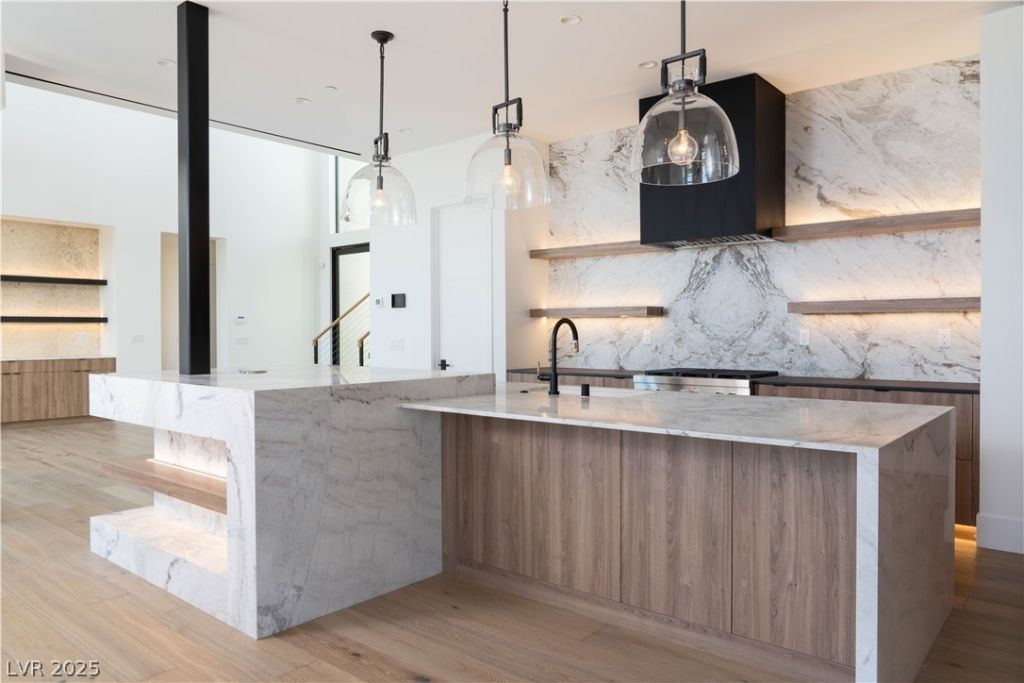 Located within The Estates at Lone Mountain, this turnkey, half-acre custom home is the final residence in this exclusive nine-lot community. This Spire plan includes options of the MultiGen suite & and the upstairs 5th bd, offering a gated 5 bd & 5 & a 1/2 bth. The exterior showcases a bold metal-clad roof paired w/ natural wood & limestone for a timeless appearance. Inside, a warm modern design emphasizes the use of organic materials. Marble countertops & accent walls, limestone fireplaces, & warm wood cabinetry and flooring create a cohesive palette that feels refined. Floor-to-ceiling windows fill the home w/ natural light & frame beautiful views of Lone Mountain. Additional features include an attached RV garage, heated pool & spa, fully landscaped lot, private entry courtyard, outdoor shower, minimal HOA restrictions, Control4 smart home technology, & an integrated sound and security system for a seamless blend of comfort & sophistication