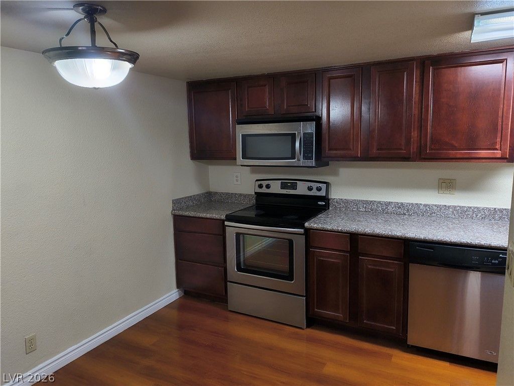 AVAILABLE FOR IMMEDIATE MOVE IN - CLEAN AND READY TO GO. Nice first floor unit with carpet & hardwood! 2 Bedrooms - great for roommate situation. Kitchen features breakfast bar, loads of cabinets, stainless steel appliances, all appliances included, nice granite in both kitchen and bathrooms. EZ access to freeways, shopping and so much more. Loads of community amenities - don't let this great opportunity pass you by. View today, reserve and make this you new Las Vegas address.