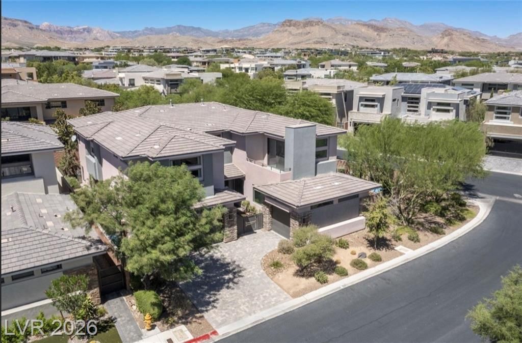 Welcome to an exceptional modern residence in the prestigious guard-gated community of The Ridges, one of the most sought-after luxury enclaves in Summerlin. Situated on a premium corner lot in Sterling Ridge, this sophisticated home offers over 4,000 sqft 4 bedrooms and 4.5 bathrooms. The open-concept design features soaring ceilings, oversized tile flooring, designer lighting, and expansive living spaces ideal for entertaining. The chef's kitchen includes quartz countertops, stainless steel appliances, and a large island overlooking the great room with fitler water. The private primary suite offers a spa-inspired bath with soaking tub, walk-in shower, dual vanities, custom his and hers walk-in closet, plus private balcony retreat. Sliding glass doors open to a covered patio and spacious yard designed for indoor-outdoor living, a private Semi Basketball Court and a spa. Exclusive access to Club Ridges, which includes a fitness center, resort-style pool, and tennis courts. A Must See!