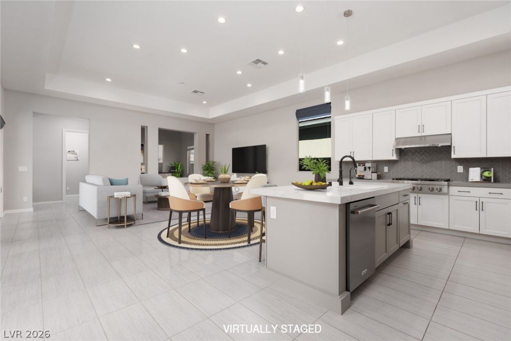 Located within the prestigious guard-gated Toll Brothers community Regency, this elegant one-story home welcomes guests with a dramatic circular foyer, architectural detail & new flooring. An open-concept design offers seamless views to the covered patio through a wall of sliding glass doors, creating effortless indoor-outdoor living & a raised planter. The chef's kitchen has upgraded quartz countertops, white cabinetry with built-in trash pull-outs, a stainless steel KitchenAid appliance package, LG refrigerator, a new $5,000 KitchenAid cooktop, & all anchored by an expansive island with counter seating. The spacious primary suite features a Luxe bath with a semi-frameless custom shower & king-sized walk-in closet. Enjoy a generous open great room/living room, dining area, a private 2nd bedroom, a den, & a laundry room with cabinets & sink. Residents enjoy a clubhouse, indoor/outdoor pools, lockers, pickleball, tennis, Bocce, fitness center, cabanas, lounge, game room, library, & more