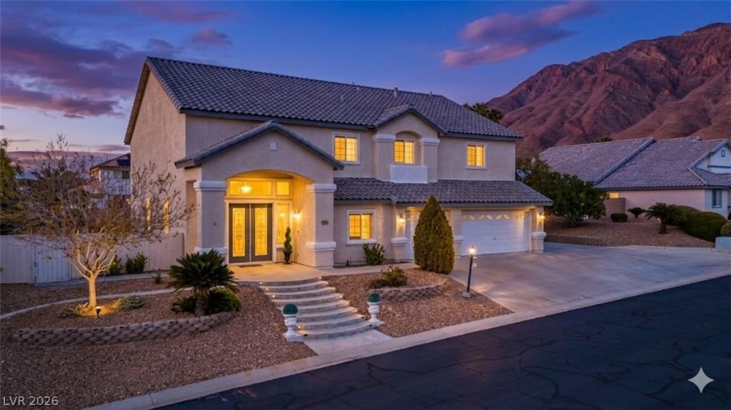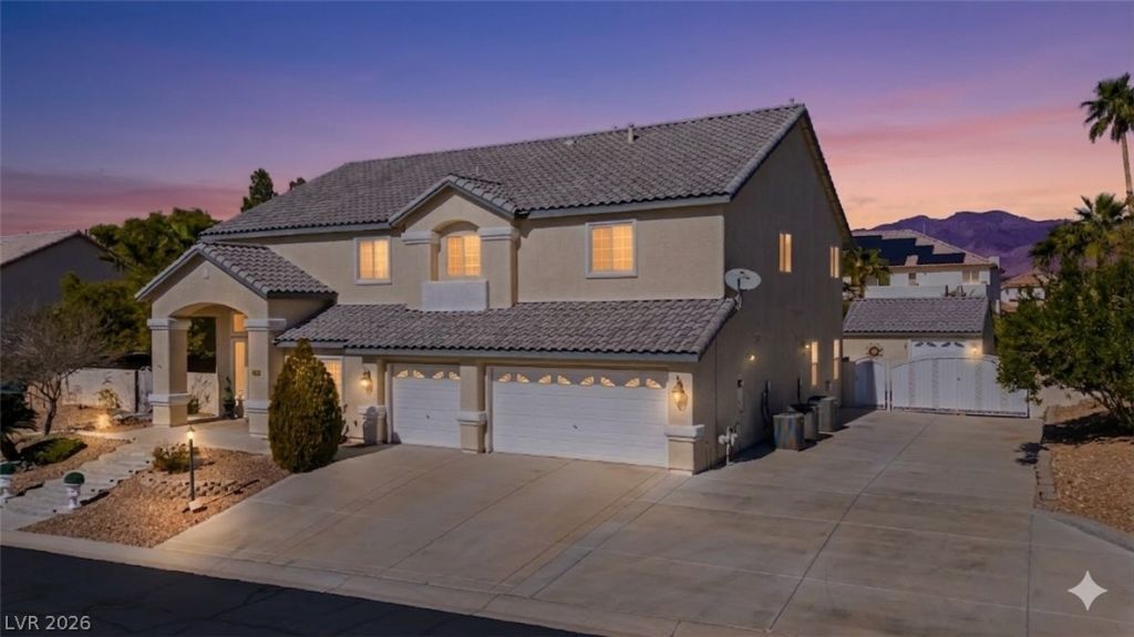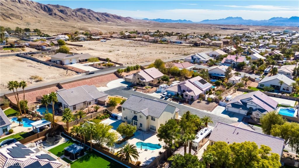 Set on an expansive cul-de-sac lot within a quiet gated community featuring a large park, this impressive estate captures sweeping mountain and Strip views. Thoughtfully designed for elegance and everyday living, the home offers wood floors and spacious formal living & dining rooms ideal for entertaining. The inviting kitchen features a large island, granite countertops, stainless steel appliances, & generous storage. Outdoor living is elevated with a sparkling pool & a fully equipped outdoor kitchen complete with a built-in grill and sink. RV parking, 3 car garage , & a detached workshop with additional garage space provide exceptional flexibility. The expansive primary suite is a true retreat with a private loft or office & a spa-inspired bath featuring dual vanities, a separate tub and shower, and dual closets. Generously sized rooms throughout enhance comfort and privacy. Recent upgrades include new plumbing, a water softener, & three new AC units. Optional furnishings included .