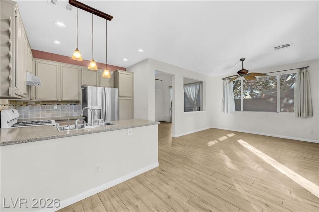 Great, 3 bed, 2.5 bath home in the highly desirable Summerlin master-planned community?on the market for the first time! This 1,478 sq ft two-story home features an open layout with high ceilings, upgraded flooring, a neutral color palette & plenty of natural light throughout. Spacious living room w/fireplace opens to the kitchen & breakfast nook with French doors. Kitchen offers updated countertops & backsplash, ample cabinet space, breakfast bar, & refrigerator included. Upstairs includes an updated primary bathroom with dual sinks, separate shower, & soaking tub. Secondary bedrooms are well-sized, with one featuring a Murphy bed that conveys with the property. Upstairs washer & dryer also convey. Private backyard w/covered patio & low-maintenance landscaping. Welcoming front courtyard entry adds charm and privacy. A spacious 2-car garage is ideal for parking and storage. Conveniently located near parks, schools, shopping, and dining. Move-in ready and can accommodate a quick close.
