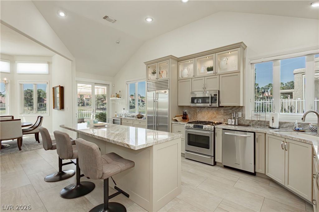 Totally remodeled stunner, this home offers the perfect blend of luxury, comfort, and breathtaking views in the heart of Las Vegas. Ideally positioned with a southwest-facing orientation, this property captures stunning sunsets over a picturesque golf course, tranquil pond, and serene waterfall. Discover this bright, open-concept floor plan with vaulted ceilings, abundant natural light, and elegant modern finishes throughout. The fully renovated interior showcases a designer kitchen with upgraded cabinetry, stone countertops, stainless steel appliances, and a spacious island that seamlessly flows into the living and dining area, perfect for both everyday living and entertaining. The primary suite is a private retreat featuring generous space, direct outdoor access, and a spa-inspired bathroom with a large walk-in shower and dual vanities. Additional features include a huge covered patio area and a rare climate-controlled garage. Furniture is available to be purchased w/ a bill of sale.